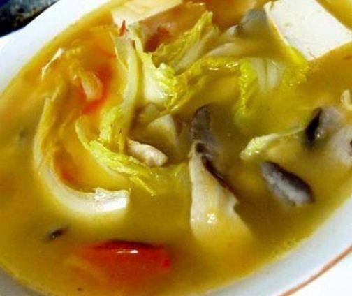 材料:平菇200克,豆腐100克,白菜200克,水適量,蔥花適量,鹽1小茶匙,高湯精1小勺