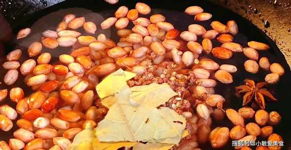2、兩個小時後把泡好的花生倒入鍋中,加入八角、桂皮、花椒、香葉,再加上適量的食鹽,開鍋後中火煮20分鐘後撈出晾涼。