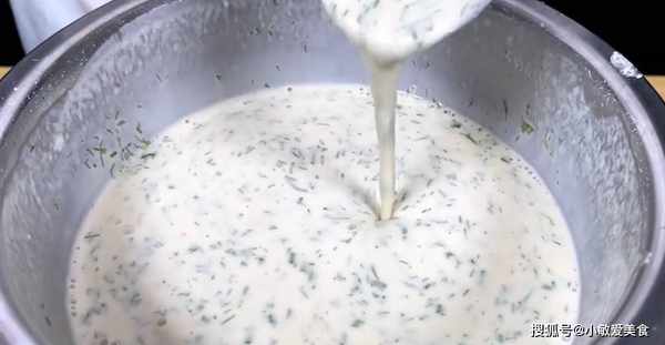 2、250克中筋面粉加入三克鹽,先將鹽攪拌均勻,再打入一個雞蛋,然後我們再加入450克的清水,邊倒邊攪拌,慢慢的攪拌,慢慢的加,攪拌到看起來細膩光滑,沒有面疙瘩,再加入切好的茴香末,攪拌均勻,面糊就和好瞭。