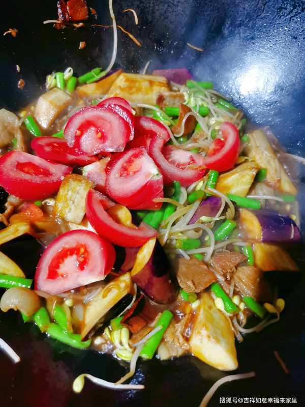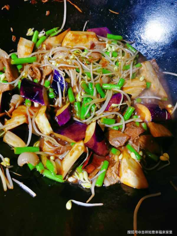 鍋中燒油,油熱後放入肉片,肉片炒至焦黃後,放入大蔥一起翻炒,依次放入豆角、豆芽、茄子、番茄,加入鹽、生抽、老抽、蠔油、香葉、八角、幹辣椒段,一起翻炒均勻,加適量熱水,一起放入燉鍋中燉煮至豆角軟爛即可,另起鍋燒水,水開後下入面條,煮熟後撈出即可,這樣簡單的豆角西紅柿豆芽撈面條就做好瞭。