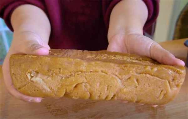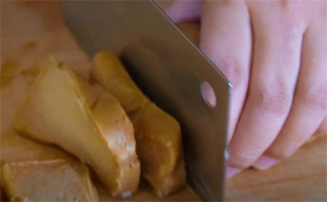 5.年糕做到這一步其實就已經可以吃瞭,為瞭更好吃一點,咱們把它切成薄片。