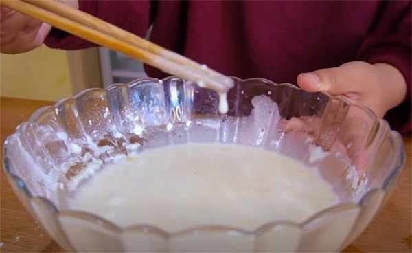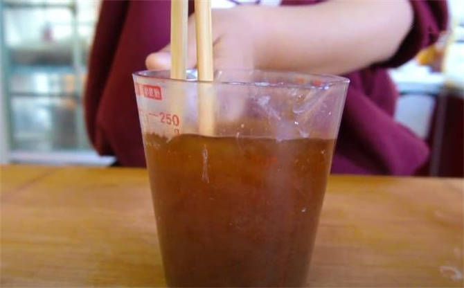 1.這個是330g的溫水,倒上60g的紅糖,多攪拌一會兒,把這些糖給攪化瞭。