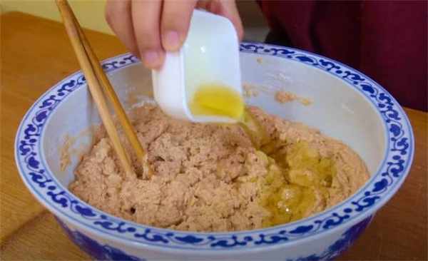 6.現在我們調一個面糊,碗裡面倒上面粉,再來一點淀粉,再放泡打粉,然後加清水,最後放油,攪拌成比較細膩的面糊就行瞭,然後把年糕放進去。