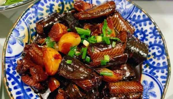 第三個大菜是紅燒鱔筒。先洗凈黃鱔內腔的血污,然後用鹽擦去黃鱔表面的黏液,反復2次後用水沖幹凈。不沾鍋中加入切好的鱔段,用中小火翻炒,待黃鱔身上的黏液全部沾在鍋上,然後再將黃鱔和鍋沖洗幹凈。最後把處理好的鱔段放入油鍋,加入調料,大火煮沸後換小火悶煮到黃鱔軟糯即可。
