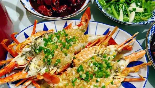 西西做的是蒜蓉開背對蝦。先將活蝦洗凈,用牙簽從背脊上挑出沙筋,用刀在蝦背處劃開蝦背,然後在開好背的蝦裡加生抽、蠔油、鹽、黃酒,醃漬大約20~30分鐘。將大蒜頭剝好拍爛並剁成蒜茸待用。然後用淺盤將醃漬好的蝦整齊排放在盤中,均勻撒上蒜茸,將剛才醃過蝦的調料倒少許在蝦上,均勻再撒少許鹽。蒸鍋加水燒開,將蝦放入鍋中隔水蒸,大約10分鐘,就可以撒上蔥花上桌啦。