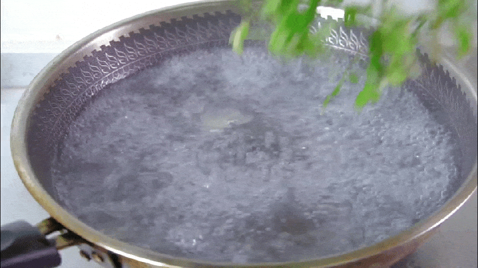 2、起鍋燒水,水開把艾草倒進來焯水,焯水的時候加5克小蘇打,能讓艾草保持翠綠的顏色。