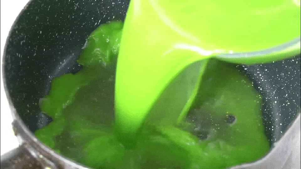 6、做好的艾草汁倒入鍋中,大火煮開,煮到沸騰後就可以關火揉面瞭。