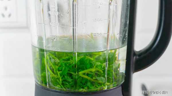4、擠幹水分的艾草放入破壁機,再加適量清水打成細膩的艾草汁。