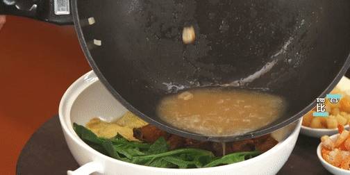 擺盤放入菠菜,將沸騰的湯汁澆在菠菜上。