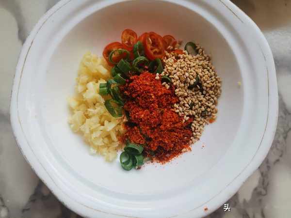 第七步:這時來調拌蘸料,大蒜剁成蒜末,辣椒粉適量,葱末少許,熟白芝麻少許,用燒熱的花生油潑上,激發出香味。