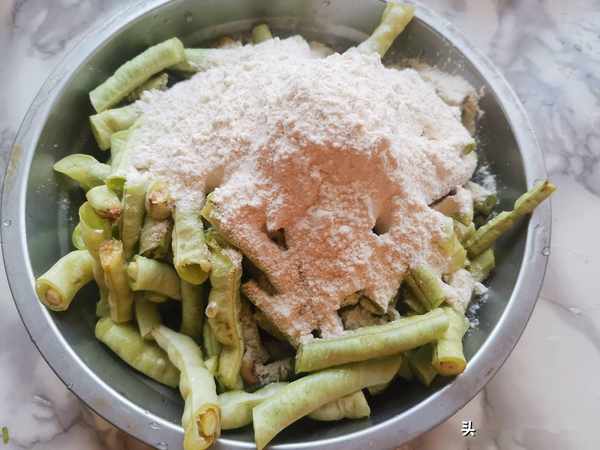 第四步:加入半杯麵粉,利用豆角表面的水分就可以了,不需要額外加水。