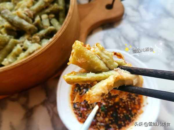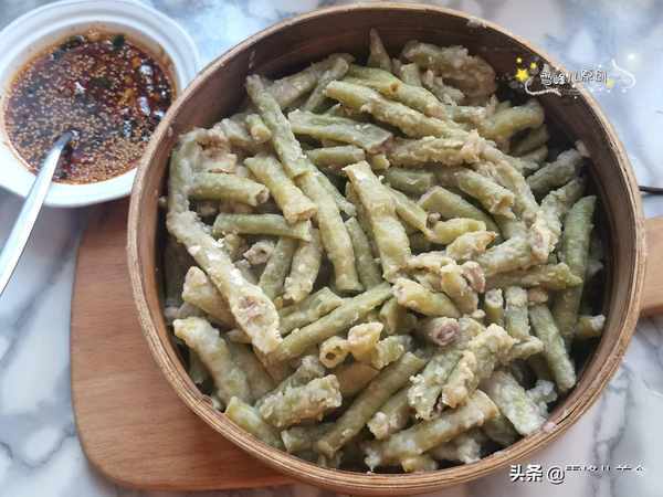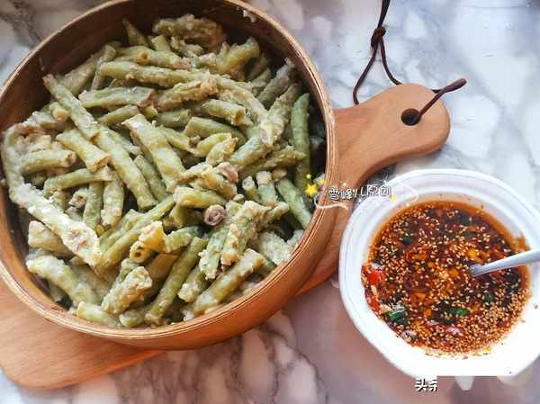 所用資料:豆角1斤,麵粉半杯,鹽少許。蘸料:蒜末,葱末,杭椒圈,幹辣椒面,芝麻,花生油2勺,蚝油1勺,生抽1勺,醋1勺。