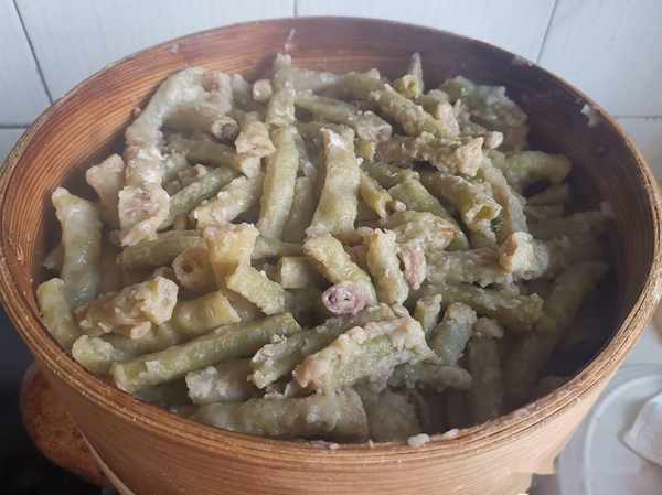 第六步:把粘上麵粉的豆角,均勻的鋪在篦子上,大火燒開,蒸大約10分鐘,熟透即可。