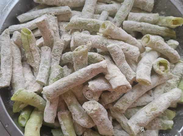 第五步:把豆角的表面抓勻,使豆角表面都沾上一層薄薄的麵粉。