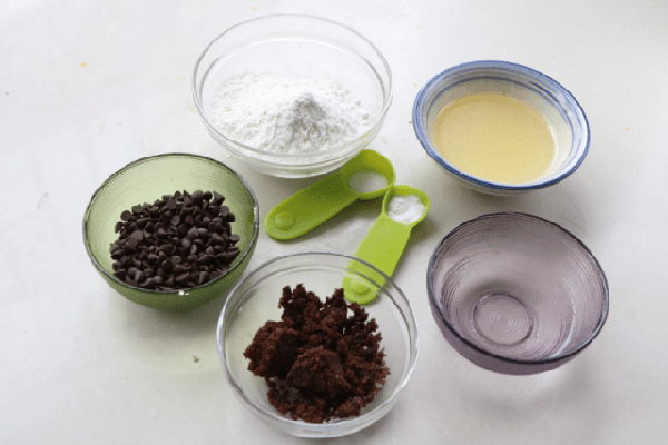 制作配方:低筋面粉100克、玉米油50克、熱水40克、紅糖50克、巧克力豆50克、泡打粉2克、鹽2克。