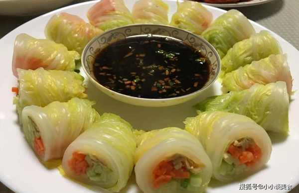 4、卷心菜葉卷好後對半切開;在蘸醬中混合鹽、糖、麻油和生抽。