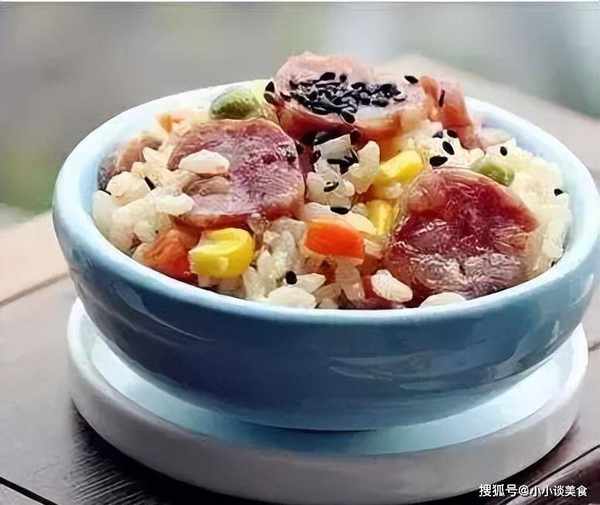 材料:蓋飯、香腸片、雜菜(豌豆、胡蘿卜碎、玉米粒)、蔥、薑、鹽、醬油。