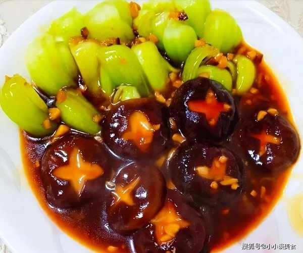 原料:青菜200克,香菇200克,醬油、白糖、香醋、蒜末、薑末、淀粉適量。