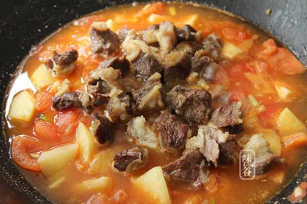 4、鍋裡重新放油,放入西紅柿翻炒出汁,倒入牛肉和土豆,加生抽、老抽和少許鹽調味,加熱水,大火燒開轉小火慢燉至少1個小時。