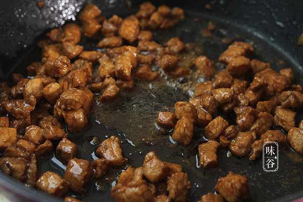 2、豬肉切成毛豆大小的小肉丁,放入料酒、白糖、生抽、老抽、淀粉醃制一會兒,鍋熱油滑鍋,稍多一點,下肉丁快速翻炒變色斷生,出鍋裝盤備用。