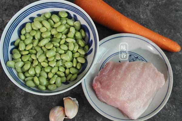 【食材】:毛豆 適量,料酒 1勺、老抽 1勺,豬肉 適量,大蒜 3瓣、胡蘿卜 適量、糖 少許,雞精 1小勺,生抽 2勺,