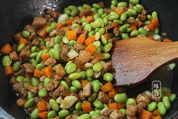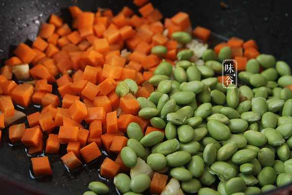 3、保留底油下薑蒜末炒香,下胡蘿卜和毛豆炒出香味,加一小碗熱水蓋鍋蓋悶煮5分鐘;