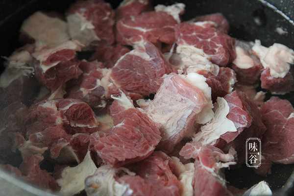 2、牛肉切塊,涼水浸泡去血水,接著牛肉冷水入鍋,加蔥薑、料酒,焯水瀝幹備用;