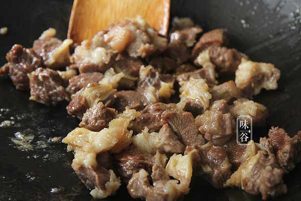 3、鍋中倒入少許油,幾小塊冰糖,小火慢慢融化至深褐的糖色,放入焯過水的牛肉翻炒上色,盛出備用;