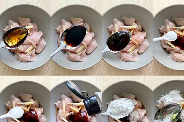 3、在碗中加入1勺料酒、1勺生抽、1勺蠔油、1小匙鹽、1小匙糖、少許胡椒粉、1勺淀粉、1勺植物油;