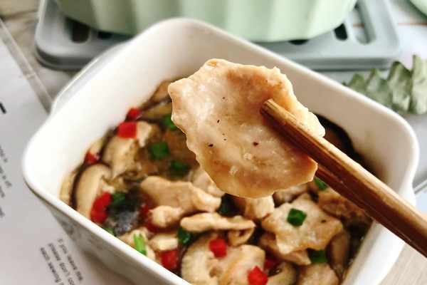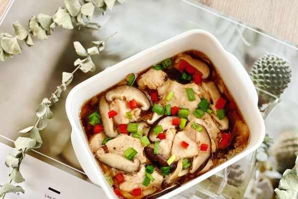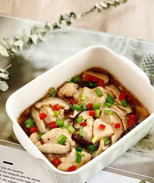 用料:雞胸肉1塊,香菇3朵,薑3片,料酒1勺,生抽1勺,蠔油1勺,鹽、糖、胡椒粉各1小匙,植物油1勺,淀粉1勺,蔥花、紅椒丁適量