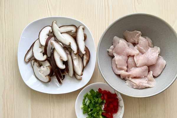 做法:1、香菇洗凈切成片,雞胸肉洗凈切成片,蔥花切好,紅椒丁切好(或者用小米椒);