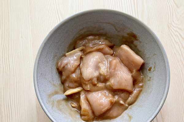 2、雞胸肉片放入碗中,加入切好的薑絲;