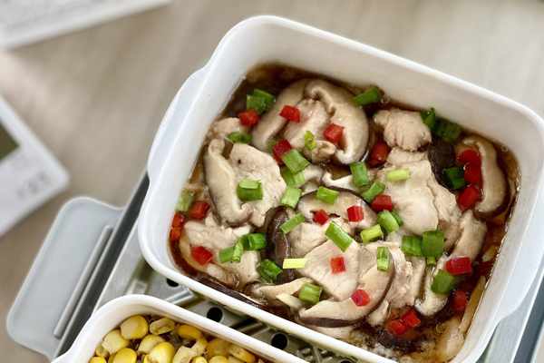 6、醃制好的香菇滑雞放入蒸鍋,放入蒸鍋蒸制20分鐘,蒸好後撒入蔥花、紅椒丁點綴即可。