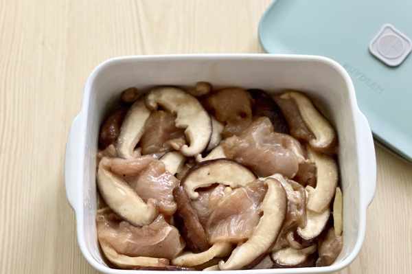 5、雞肉中再加入香菇片抓勻,放入蒸碗中,醃制半小時。