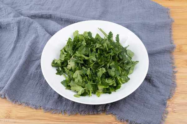 2、將香菜洗凈後,去掉根部,切成細末,放入碗中。