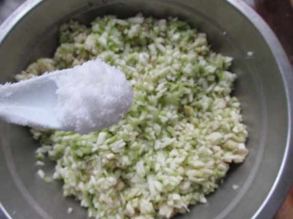 2,絲瓜的含水量比較大,要用鹽煞去多餘的水分,不然在包餃子的時候餡料就會出很多的水。