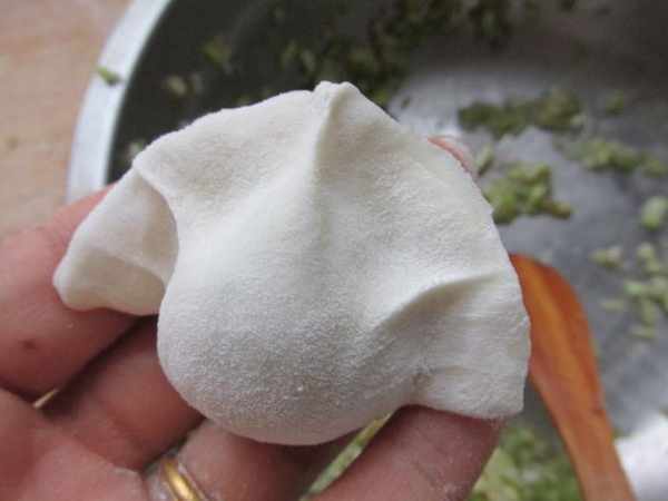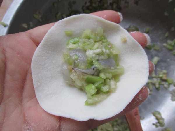 放上餡料,餡料的多少可以隨意。其實這樣的餡料多放些好吃,也可以儘量的多放一些。