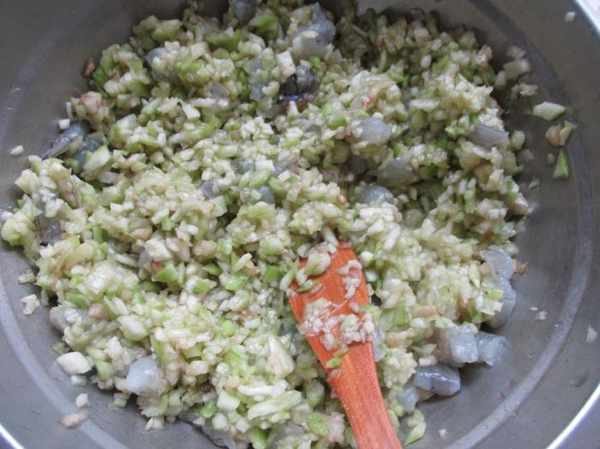 絲瓜去皮後,用刀切成小丁,剁細,然後加入少許的鹽,醃漬大約10分鐘,把絲瓜中的水分去掉。