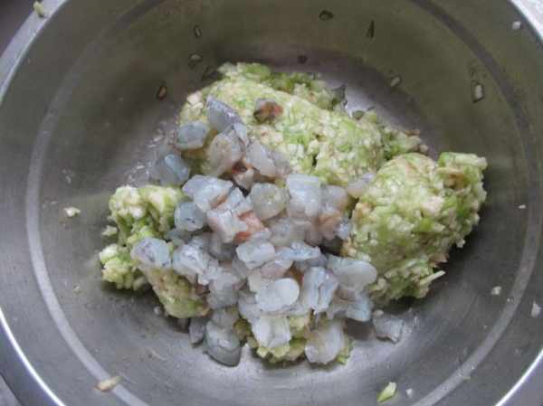 捏去水分的絲瓜放到盆裏,把鮮蝦去掉外殼,挑去蝦線,成蝦仁切成顆粒放入,然後放入葱末,薑末。