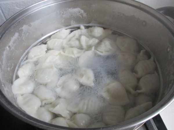 大一些的鍋裏放入清水燒開,煮上餃子,用勺子輕輕推動防止粘鍋,蓋上蓋子煮開,然後撒冷水,繼續煮,熟透後撈出。
