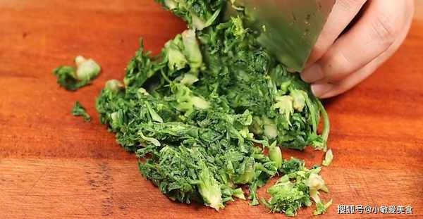 2、放入涼水中過涼。再將薺菜撈出來,用手擠幹水分。把薺菜放案板上面,用刀給它切碎一些。薺菜切好後盛到盤裡面。
