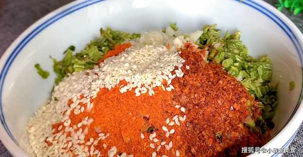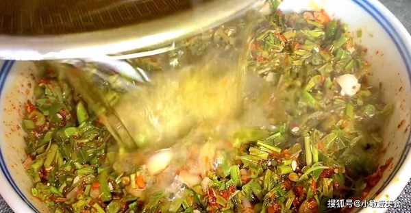 4、鍋裡倒入比平時炒菜多兩倍的油,燒至冒煙,然後分三次把熱油澆在食材的上面,激發出辣椒面、白芝麻和蒜末的香味,攪拌均勻。