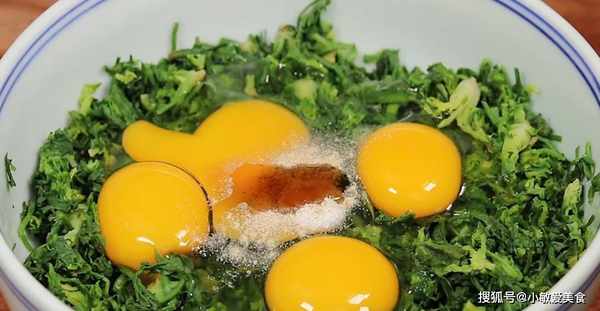 4、鍋中加入適量的食用油。油熱之後,倒入薺菜雞蛋液。用鏟子按壓平整。小火煎至一面定型後,翻個面,用鏟子搗碎一些,煎至雞蛋液定型就可以瞭。這樣一道色香味俱全的薺菜炒雞蛋就做好瞭。