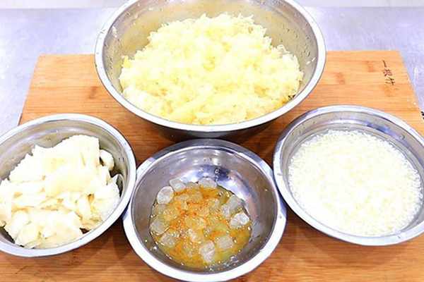 1.將銀耳放入冷水中浸泡1小時,泡發,去掉硬根,撕成小塊;梨去皮切片;將一把冰糖放入碗中,加入適量的桂花醬以增加香味;再準備半碗黃酒備用。