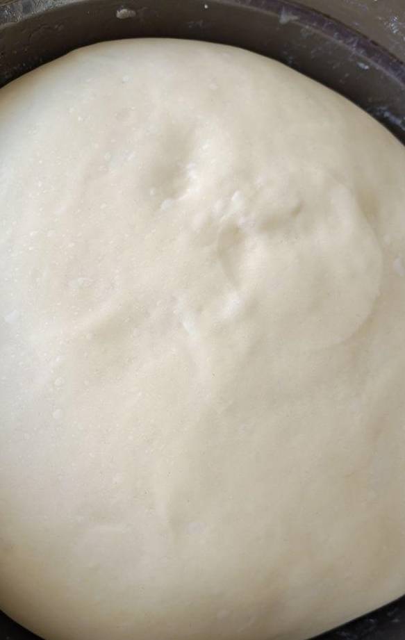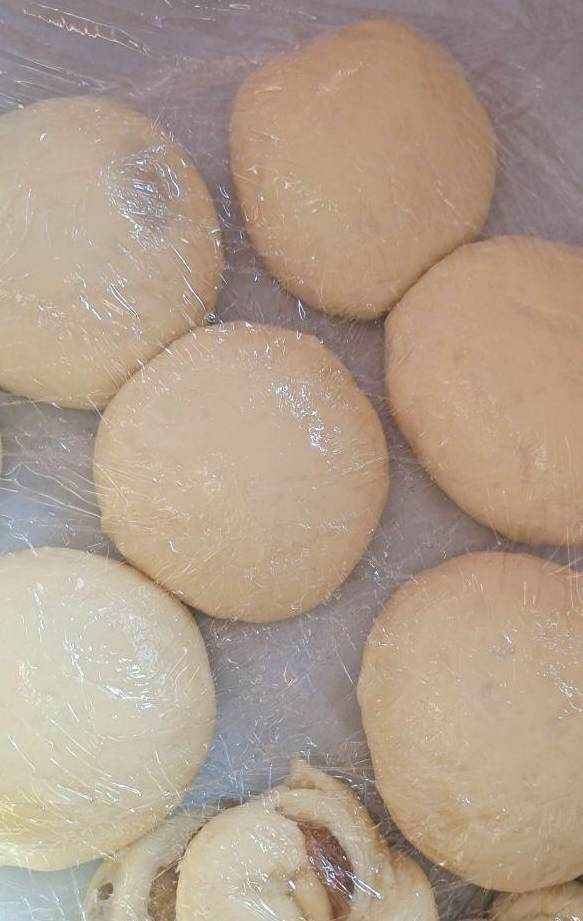 發酵好以後接著揉面,排氣,然後分成10個小劑子,想吃帶葡萄幹的可以包入小劑子裡。放在烤盤蓋上保鮮膜繼續發酵2倍大。如圖(圖中有兩個扁的是加瞭椰蓉葡萄幹不怎麼好吃,口感一般不太推薦可以忽略)