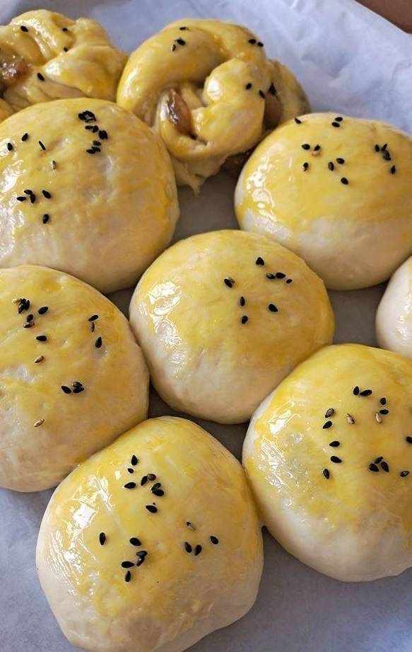 發酵好以後刷上蛋黃液,灑上少許芝麻,烤箱提前預熱幾分鐘。下火165°上火150-160°大約烤20~25分鐘左右,註意觀察。(當烤制過程中看到表面有些變色時拿出蓋上一層錫紙,可以防止烤硬,註意不要燙到手!!)