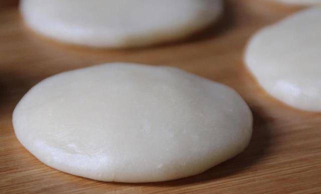 4.將面團分開揉勻,搟成中間厚邊薄的餅狀,搟入適量糖餡,搟成球狀,壓緊,搟平.,糖餅會形成胚芽,剩下的表面依次準備。