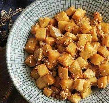 5、杏鮑菇裹上醬油,最後撒上白芝麻拌勻。