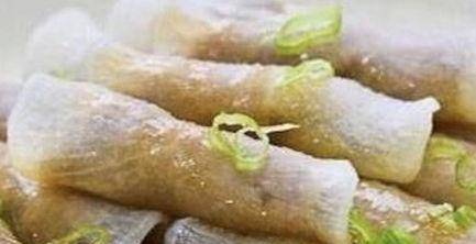 6、取蘿卜一塊,將拌好的餡料放入,卷起收口,裝盤。