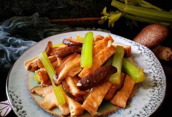 材料:芹菜2支、香幹5片、香菇4朵、生抽1湯匙、素蠔油1湯匙、鹽1/3匙、薑末適量